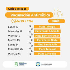 El área de Bromatología de la Municipalidad de Carlos Tejedor informa el cronograma de vacunación antirrábica de mascotas que se realizará en la ciudad cabecera, de 10 a 12hs: Lunes 10/6: Plaza Principal Miércoles 12/6: Plaza Barrio Alborada Viernes 14/6: Plaza Barrio Kirchner Martes 18/6: Plaza Barrio Norte Lunes 24/6: Plaza Barrio Italia Miércoles 26/6 Plaza Terminal Viernes 28/6: Plaza B...