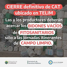 El Centro Almacenamiento Transitorio (CAT) que recibía envases vacíos de fitosanitarios en la planta de TELIM de Carlos Tejedor se encuentra definitivamente CERRADO. Por este motivo ya no se recibirán en la planta bidones de ningún tamaño, ni cartón provenientes de fitosanitarios. Se solicita a todos y todas las implicadas en esta actividad que se respeten las medidas y conserven en sus establecim...