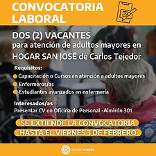 CARLOS TEJEDOR: DOS VACANTES LABORALES PARA ATENCIÓN EN EL HOGAR SAN JOSÉ
