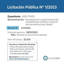 La Municipalidad de Carlos Tejedor llama a Licitación Pública N° 1/2023 para la contratacion de Locacion Comercial del local destinado a confiteria-restaurant de la terminal de Carlos Tejedor Decreto: 427/23 Fecha de apertura: 30/01/2023 - Hora: 10:00