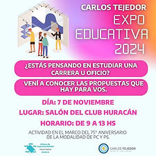 Este año, la Expo Educativa se realiza en el marco del 75° aniversario de la modalidad de PC y PS Y llega con todo para brindar a las y los jóvenes una jornada llena de oportunidades para su futuro académico y profesional. Fecha: 7/11/2024 Lugar: Club Huracán de Carlos Tejedor Horario: 9 a 13 hs Durante el evento, las instituciones de Formación Superior y de Formación en Oficios estarán present...