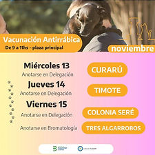 El área de Bromatología de la Municipalidad de Carlos Tejedor informa que se llevará a cabo una nueva campaña de Vacunación antirrábica para perros y gatos, conforme al siguiente cronograma: De 9 a 11hs en la plaza principal Miércoles 13 Curarú (Inscribirse previamente en la Delegación) Jueves 14 Timote (Inscribirse previamente en la Delegación) Viernes 15 Tres Algarrobos (Inscribirse previa...