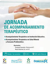 El próximo sábado 1 de noviembre, desde las 8:30 horas, se realizará en el SUM del Jardín Maternal Municipal una Jornada de Acompañamiento Terapéutico, centrada en el trabajo del A.T. en instituciones educativas, salud mental y consumo problemático. La actividad, organizada por la Dirección de Discapacidad, la Secretaría de Desarrollo de la Comunidad y la Secretaría de Salud del Municipio de Daire...
