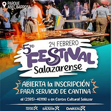 El próximo 24 de febrero llega la 5° Edición del Festival Salazarense, para lo cual ya está abierta la Inscripción para instituciones, feriantes y artesanos que quieran participar del mismo en el Parque Abel Barrosa. Instituciones de Salazar: Inscribirse en el Centro Cultural o comunicarse al: 02393-401110 Feriantes y artesanos Inscribirse en la Secretaría de Desarrollo de Salazar (vivero) o comun...