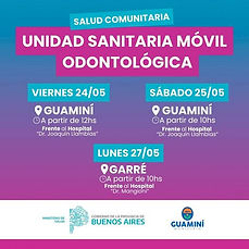 La UNIDAD SANITARIA ODONTOLÓGICA MÓVIL llega al distrito de Guaminí junto al Ministerio de Salud de la Provincia de Buenos Aires, garantizando que todos los vecinos y vecinas tengan acceso a un sistema de salud de calidad. El cronograma es el siguiente: Guaminí: viernes 24/5 12 hs. (frente al hospital "Dr. Joaquín Llambías") Guaminí: sábado 25/5 10 hs. (frente al hospital "Dr. Joaquín Llambías"...