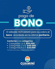 En el marco del último acuerdo paritario alcanzado junto a los gremios locales, el intendente José Augusto Nobre Ferreira dispuso el pago de un bono por única vez para las y los agentes municipales. El mismo estará disponible a partir de la 0 hora de este sábado 13 de septiembre: • Categorías 1 a 6: $50.000 • Categorías 7 a 10: $40.000 • Categorías 11 a 17: $30.000 (Excluidos funcionarios y categ...