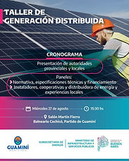 El próximo miércoles 27 de agosto a las 15:30 hs te invitamos a participar del Taller de Generación Distribuida, que se desarrollará en el Salón Martín Fierro, Balneario Cochicó. 📌 Durante la jornada se contará con la presentación de autoridades provinciales y locales, además de paneles sobre: ✔️ Normativa, especificaciones técnicas y financiamiento. ✔️ Experiencias locales con instaladores, coop...