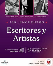 Este 15 de noviembre se llevará a cabo el Primer Encuentro de Escritores y Artistas en Pehuajó. Desde las 16 horas podrán disfrutar de una tarde llena de música en vivo, lecturas y exposiciones en el Complejo Cultural Cine Zurro, en Alem 530, Pehuajó Entradas gratuitas Organiza: Grupo Cultural Aliarte...