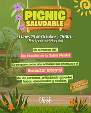 En el marco del Día Mundial de la Salud Mental, el próximo lunes 13 de octubre a las 16:30 h se realizará un Picnic Saludable en el patio del Hospital Municipal de Pellegrini. La actividad, abierta a toda la comunidad, propone un espacio de encuentro para disfrutar, compartir y reflexionar sobre el bienestar integral. La jornada busca poner en valor la salud entendida como un equilibrio entre lo f...