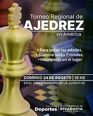 Este domingo 24 de agosto se realizará en Rivadavia un nuevo Torneo Regional de Ajedrez, abierto a niños, jóvenes y adultos. El torneo se realizará en el Departamento de la Juventud (Rivadavia 76), desde las 10:00 hs ♟️ Sistema Suizo, 7 rondas 📝 Inscripción en el lugar Además, contaremos con servicio de cantina y venta de libros de ajedrez. 👉 ¡Sumate y viví una jornada a puro ajedrez!...