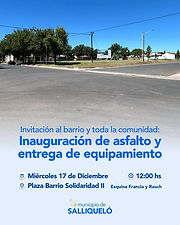 Este miércoles 17 de diciembre, a partir de las 12:00 horas, se llevará a cabo la inauguración de la obra de asfaltado y la entrega de nuevo equipamiento en el Barrio Solidaridad II. La actividad tendrá lugar en la plaza del barrio, ubicada en la esquina de las calles Francia y Rauch. La iniciativa forma parte de las acciones destinadas a mejorar la infraestructura urbana y fortalecer los espacios...