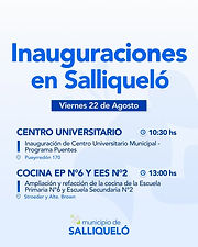 La Municipalidad de Salliqueló informa que el día viernes se llevarán a cabo dos inauguraciones muy importantes para el distrito ✅ 10:30 hs | Inauguración del Centro Universitario Municipal – Programa Puentes. ✅ 13:00 hs | Inauguración de la cocina de la EP N°6 y la EES N°2, tras su ampliación y refacción....