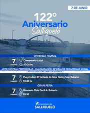 Este sábado 7 de junio, Salliqueló celebra su 122° Aniversario con distintas actividades organizadas por el Municipio. A las 10 horas se colocará una Ofrenda Floral en el Cementerio Local A las 10:30 hs se realizará el Acto Central Protocolar e Inauguración de la Oficina de Desarrollo Social, ubicada en Pueyrredón 89 (al lado del Cine Teatro Sociedad Italiana). Se solicita a las instituciones in...