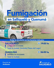 La Dirección de Ambiente de la Municipalidad de Salliqueló informa que hoy y mañana se realizarán tareas de fumigación. Pedimos evitar la circulación en los horarios indicados. Salliqueló 📍 Toda la ciudad (incluido el Paseo del Lago) — hoy desde las 19 hs. Quenumá 📍 Toda la ciudad — mañana desde las 6 hs....