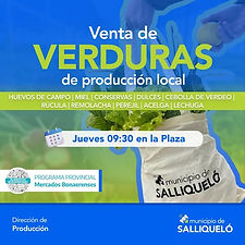 La Dirección de Producción de la Municipalidad de Salliqueló informa que este Jueves desde las 09.30 horas se llevará a cabo la venta de verduras de producción local en la plaza principal, pudiendo encontrar en la misma cebolla de verdeo, acelga, rúcula, conservas, perejil, lechuga, habas, miel, huevos de campo....