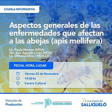 La Dirección de Producción del Municipio de Salliqueló invita a esta charla sobre los aspectos generales de las enfermedades que afectan a las abejas Apis mellifera, a cargo de destacados profesionales: Lic. Paula Mouras (MDA) Téc. Agustín Linari (MDA) Lic. Dimena Silvia (MDA-CIC) La misma se llevará a cabo este Viernes 22 de noviembre a las 19:30 hs en el Centro Cultural...