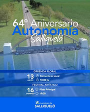 Compartimos el Cronograma de actividades por el 64° Aniversario de la Autonomía de Salliqueló 📍 Jueves 13 de Noviembre: Ofrenda floral en el Cementerio Local, 10:00 hs. 📍 Domingo 16 de Noviembre: Festival artístico en la Plaza Principal, 19:00 hs. Los esperamos para celebrar juntos un nuevo aniversario de nuestra autonomía y compartir en comunidad....