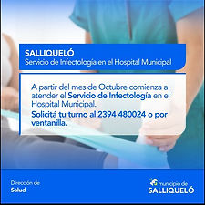 La Dirección de Salud del municipio de Salliqueló informa que a partir de este mes de octubre comienza a funcionar el Servicio de Infectología en el Hospital Municipal de Salliqueló. Podés pedir tu turno llamando al 2394 480024 o en ventanilla....
