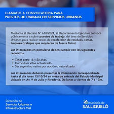 El Departamento Ejecutivo del municipio de Salliqueló convoca a cubrir vacantes para realizar tareas de recolección de residuos, ramas y limpieza. Si tenés entre 18 y 50 años y cumplís con los requisitos, podés presentar tu currículum hasta el 15/10/24 en mesa de entrada del Palacio Municipal. Dirección: Av. 9 de Julio y Rivadavia. Horarios: de lunes a viernes de 7 a 13hs....