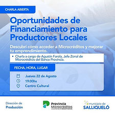 El próximo 22 de agosto a las 19 hs, el Municipio de Salliqueló invita a una charla abierta en el Centro Cultural dirigida a productores agropecuarios, ganaderos, comerciantes, Pymes y a toda la comunidad en general. Agustín Farola, Jefe Zonal de Microcréditos del Banco Provincia, compartirá valiosa información sobre cómo acceder a financiamiento para impulsar tu emprendimiento, sin importar el se...