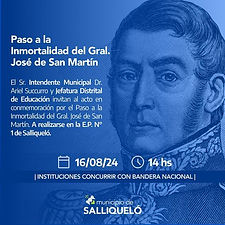 El Municipio de Salliqueló, junto a la Jefatura Distrital de Educación, invita a toda la comunidad a participar del Acto Central en conmemoración del 17 de Agosto, en homenaje al Padre de la Patria, el General José de San Martín. El acto tendrá lugar este Viernes 16 de Agosto a las 14:00 hs en las Instalaciones de la Escuela Primaria N°1 Se Invita a todas las instituciones a acompañarnos con sus b...