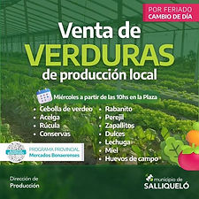 La Dirección de Producción de la Municipalidad de Salliqueló informa que este miércoles 19 de junio desde las 10 horas se llevará a cabo la venta de verduras de producción local en la plaza principal. Venta de Verduras de Producción Local, pudiendo encontrar en la misma cebolla de verdeo, chaucha, berenjena, conservas, morrones, albahaca, zapallitos, dulces, entre otros....