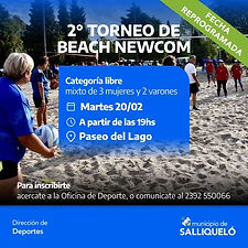 La Dirección de Deportes de la Municipalidad de Salliqueló invita a participar del 2° Torneo de Beach Newcom que tendrá lugar este martes 20 desde las 19:00 hs en el Paseo del Lago Habrá carrito de comidas y sillas para que puedan disfrutar de todos los partidos. También podes llevar tu reposera! Te esperamos para compartir una tarde-noche llena de deporte y buena compañía!...