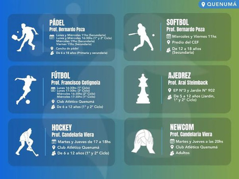 La Dirección de Deportes de la Municipalidad de Salliqueló informa que desde el mes de abril estarán disponibles diferentes asistencias técnicas deportivas en Salliqueló y Quenumá