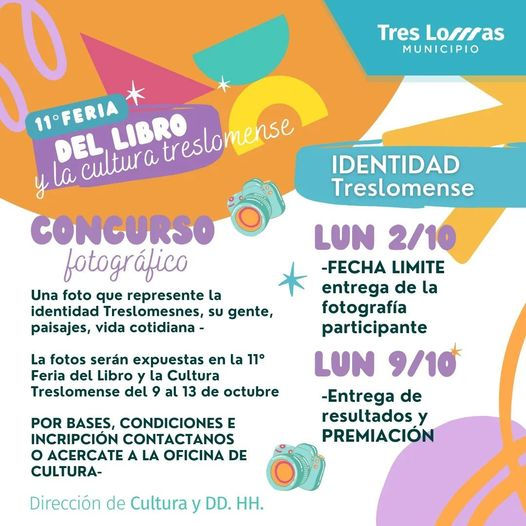 La Dirección de Cultura y DDHH de Tres Lomas convoca a participar del Concurso Fotográfico “IDENTIDAD TRESLOMENSE”, que tiene por objetivo reproducir las imágenes ganadoras para ser expuestas como gigantografías en el acceso a la ciudad y en otros puntos urbanos.