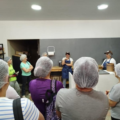 La salida fue a las 14.30 desde la Oficina de Turismo, punto de encuentro habitual, y contó con el acompañamiento del personal de Tránsito. Al llegar a la fábrica, los participantes fueron recibidos por la propietaria de la fábrica, Romina Nasiff y Graciela, quienes compartieron con entusiasmo la historia del emprendimiento, qué representa su nombre y lo que significó el trabajo en pandemia.