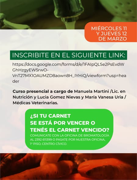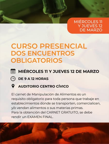 El área de Bromatología municipal informa que el miércoles 11 y jueves 12 de marzo de 9 a 12 en el Auditorio del Centro Cívico (Oro y Villegas) se dictará otro curso de Manipulación Segura de Alimentos. Los dos encuentros son obligatorios para poder obtener el Carnet de Manipulación de Alimentos, que tiene una validez de tres (3) años.