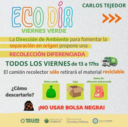 DESDE ESTE VIERNES, RECOLECCIÓN DIFERENCIADA DE RESIDUOS EN CARLOS TEJEDOR