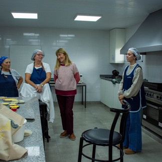 Las obras de remodelación y puesta en valor contemplaron dos espacios techados y un patio de conexión. El bloque trasero se convirtió en un amplio espacio de producción y elaboración equipado con mesadas de trabajo, cocinas completas con mayor cantidad de hornallas, revestimientos y accesorios nuevos, una isla central de trabajo, horno panadero y una sectorización inclusiva con mesada baja accesible para personas con movilidad reducida.