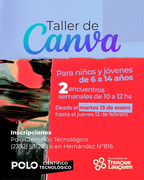 . Taller de Canva para niños y jóvenes de 6 a 14 años. El curso tendrá dos (2) encuentros semanales de 10 a 12, los martes y jueves. Comienza el martes 13 de enero y se extenderá hasta el jueves 12 de febrero.