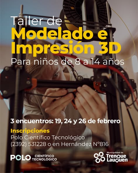 . Taller de Modelado e Impresión 3D para niños de entre 8 y 14 años. Está diagramado en tres (3) encuentros: 19, 24 y 26 de febrero de 14 a 16.