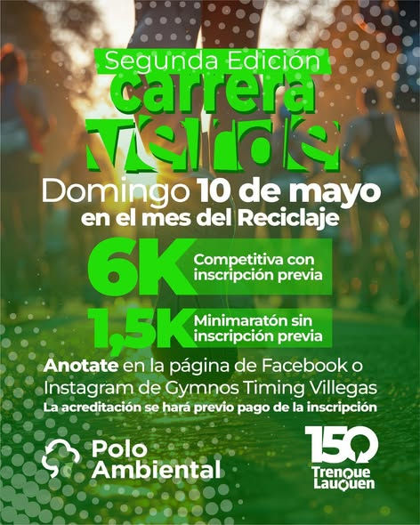La Dirección de Ambiente y Desarrollo Sustentable del Municipio, a cargo de Facundo Splendiani, recuerda que se encuentra abierta la inscripción para participar de la segunda edición de la Carrera Verde, que se realizará el domingo 10 de mayo desde las 13 en el centro de la ciudad.