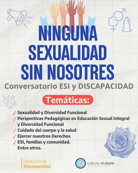 Desde la Dirección de Discapacidad de la Municipalidad de Carlos Tejedor se llevará a cabo el primer conversatorio sobre Sexualidad en la Diversidad Funcional: “Ninguna Sexualidad Sin Nosotres” que estará a cargo de Silvana Peirano profesora de Educación Especial y Especialista en Sexualidad y Diversidad Funcional.
