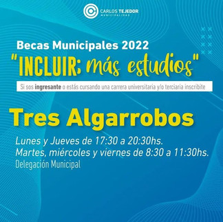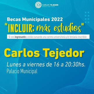 La Municipalidad de Carlos Tejedor informa que está abierta la inscripción para las Becas Municipales 2022 "INCLUIR; más estudios", que el municipio implementa año tras año, beneficiando a varios estudiantes del distrito.