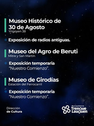 Durante esa jornada los vecinos/as podrán visitar y recorrer los distintos museos municipales: Histórico Regional, Cívico Almafuerte, Ferroviario, de Arte Mural Rodolfo Campodónico, de los Carruajes, Museo Municipal de Artes Visuales –MuMAV, Escuela Municipal de Arte Mural -EMAC y los museos de Beruti, 30 de Agosto y Girodías, a los que se sumarán el Museo Provincial de los Jardines de Infantes, el Museo de Motos Antiguas (AMAT), y el Museo “Criollo” Artigas. También participarán de la propuesta instituciones intermedias: Grupo Scout “Conrado Villegas”, Bomberos Voluntarios, la Biblioteca Pública Rivadavia y la Sociedad Italiana.