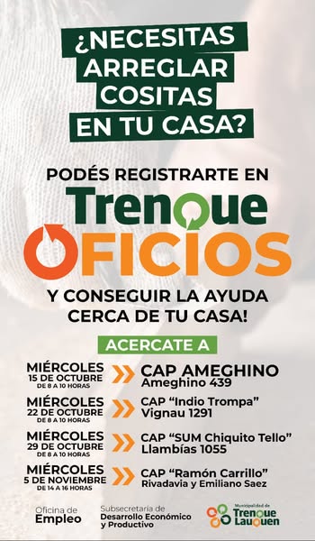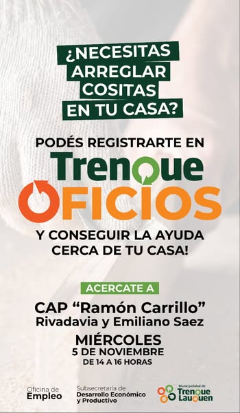 Con el objetivo de facilitar el acceso y el registro en “Trenque Oficios”, la plataforma digital que conecta a trabajadores de distintos oficios con vecinos del distrito que necesitan sus servicios, el equipo de la Oficina de Empleo del Municipio comenzará a recorrer los barrios de la ciudad desde este miércoles (15) y todos los miércoles siguientes.