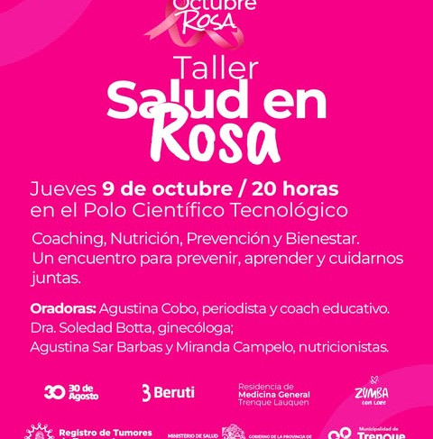 20 horas en el Polo Científico Tecnológico/Taller “Salud en Rosa”/Coaching, Nutrición, Prevención y Bienestar. Un encuentro para prevenir, aprender y cuidarnos juntas. Oradoras: Agustina Cobo, periodista y coach educativo. Dra. Soledad Botta, ginecóloga; Agustina Sar Barbas y Miranda Campelo, nutricionistas.