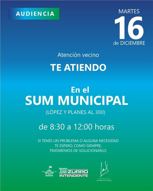 El Intendente Municipal de Pehuajó, Pablo Javier Zurro, estará atendiendo espontáneamente a todos los vecinos, mañana martes de 8:30 a 12:30 hs. en el S.U.M. Municipal, sito en López y Planes al 300.