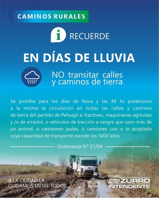 A efectos de proteger la red de caminos rurales del partido, especialmente durante el período crítico que sigue a las lluvias, se informa que durante las próximas 72 hs, (lunes, martes y miércoles) está prohibido la circulación con tractores y maquinaria agrícola, camiones con una capacidad de carga superior a los 5,000 kilos. y vehículos de tracción a sangre que utilicen más de un animal.