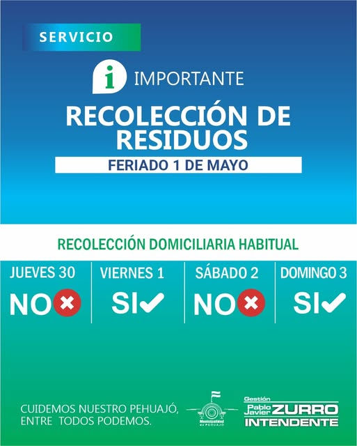 El Municipio de Pehuajó informa a la comunidad el cronograma de recolección domiciliaria habitual con motivo del feriado del 1° de Mayo:
