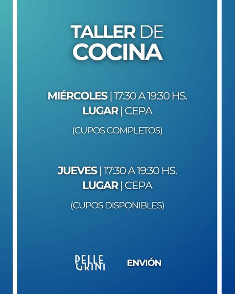La Municipalidad de Pellegrini informa que se está abierta la inscripción para nuevos días y horarios de los talleres de estética y cocina, conforme se informa en las imágenes que acompañan la presente nota