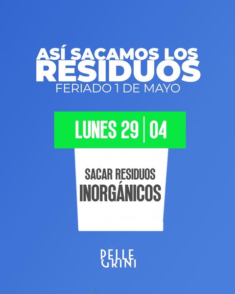 La Municipalidad de Pellegrini informa el cronograma de recolección de residuos durante la presente semana, con motivo del feriado del 1° de mayo, Día del Trabajador.