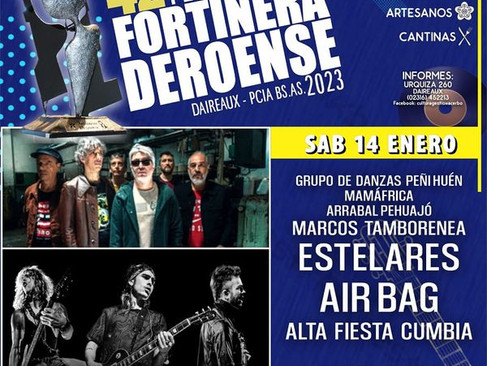 Sábado 14 de Enero: Grupo de danzas Peñi Huen, Mamafrica, Arrabal Pehuajó , Marcos Tamborenea (Tango Canción), ESTELARES, AIR BAG y ALTA FIESTA CUMBIA.