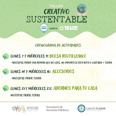 El *TALLER CREATIVO SUSTENTABLE* está dividido en tres clases: bolsas reutilizables, accesorios y adornos para tu casa.