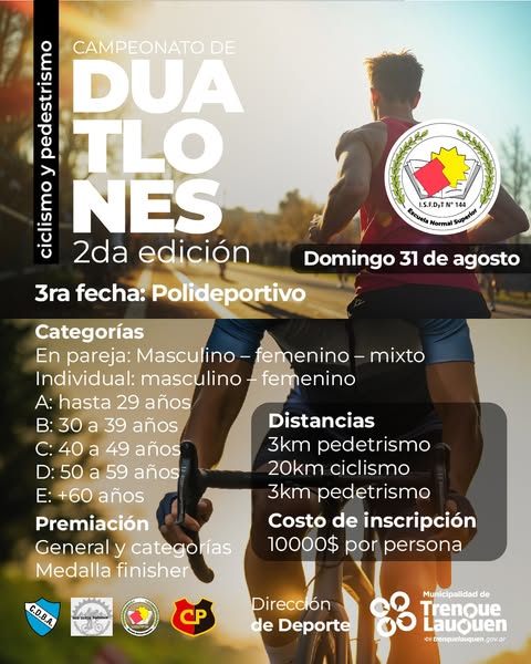 El próximo domingo 31 de agosto tendrá lugar la 3º fecha de la II edición del Campeonato de Duatlones, una propuesta que combina pedestrismo y ciclismo y que sigue creciendo con gran acompañamiento de la comunidad deportiva.