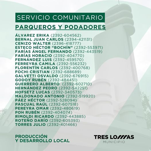 La Dirección de Producción de la Municipalidad de Tres Lomas pone a disposición de la comunidad el Listado de parqueros y podadores.